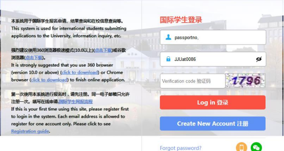 Username: Passport Number, initial password is JJUat0086. After entering the system, click "在校(current student)" in the upper right part to see all the functions of current students.